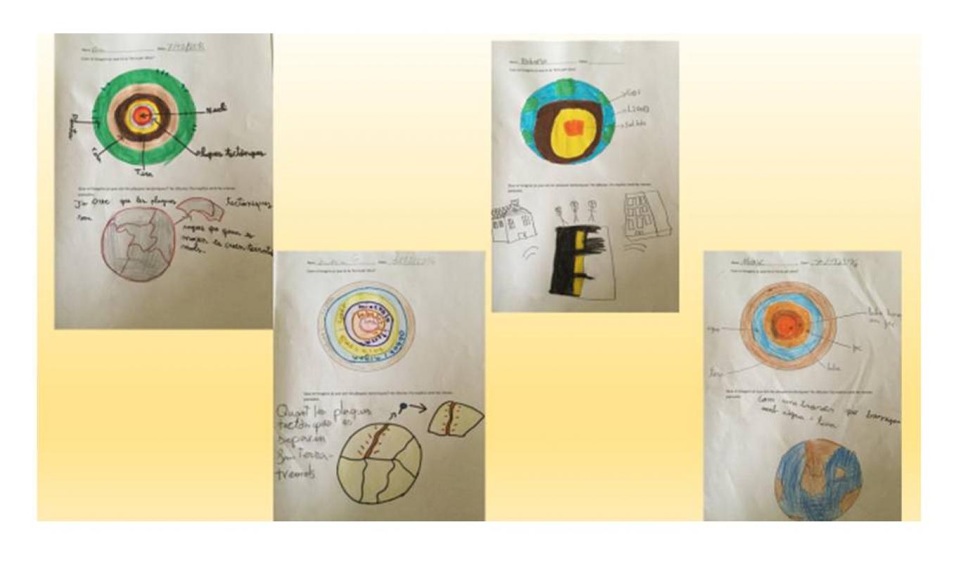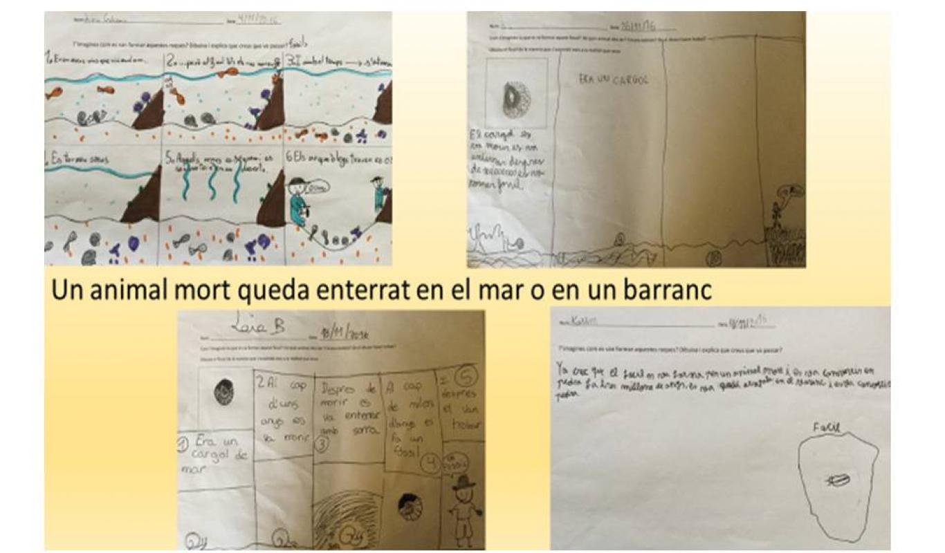 La Montse ens va portar una noticia sobre la troballa d’un fòssil d’una pell de Titanosaure i un cop llegida vam dibuixar el que havíem entès. Al cap d’uns dies vam simular com creiem que es formen els fòssils: vam agafar fang, vam fer una emprenta i la vam tapar amb sorra. Vam treure els fòssils al pati de 5è durant tot un mes. Paral•lelament ens hem imaginat com creiem que s’han format els fòssils en la realitat, fem dibuixos i escrits ens ho hem explicat els uns als altres. Per comprovar les nostres teories i hipòtesis les hem agrupat per temes: - Els que creiem que s’han format amb animals que van morir i van quedar soterrats per fang, cendres de volcans, sediments,... - Els que creiem que aquests animals vivien enganxats amb pedres i per això s’han convertit en pedra. Ara estem mirant uns vídeos i llegit articles i llibres per comprendre el que va passar en la realitat. Encara estem intentant trobar respostes i comprendre el que fa milions d’anys va succeir. Paral•lelament estem intentant ubicar en el temps els fets que estem estudiant, per això hem construït entre tots una línia del temps que va des de els primers organismes pluricel•lulars fa 1.200.000.000 anys fins l’aparició de l’home fa tan sols 2.000.000 anys. Creiem que conèixer com és la Terra per dins pot ajudar-nos a comprendre alguns fets geològics així que tot just ara comencem a imaginar-nos com creiem que és per dins el planeta que habitem. Tot `plegat ens té ben encuriosits, ben aviat esperem mostrar-vos el que estem descobrint