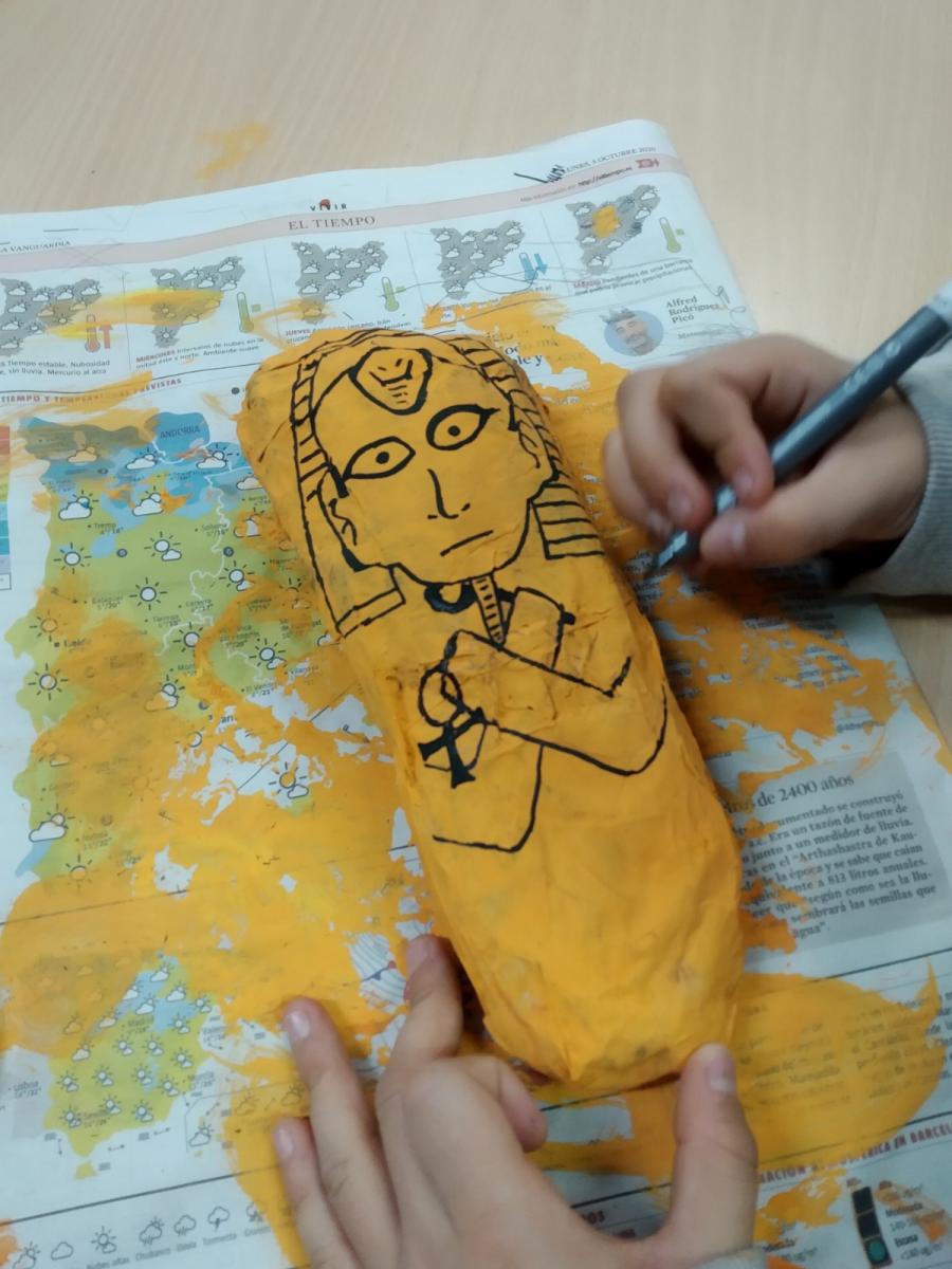 Els alumnes del grup- classe de Percussió (5è i 6è) us volem explicar com momificaven els cossos els egipcis. Estem fent el projecte de l'Edat Antiga: primer hem estudiat Mesopotàmia ara estem fent l’Antic Egipte. Els historiadors vam descobrir que les piràmides eren tombes i que la gent important era momificada. Per tal d'aprendre com es feia, ho hem recreat: -Primer vam purificar el cos (un plàtan i una taronja). -Després vam embalsamar-lo (treure-li tot l'interior i reemplaçar-lo per paper). -A continuació, vam cosir el plàtan i la taronja per tal que no marxés el paper. -Per tal que no li sortissin fongs, vam submergir-lo en natró (que és un mineral fet entre bicarbonat i sal marina) i la vam deixar dues setmanes dins d'una capsa. -Al cap de 15 dies vam treure-les del natró i vam veure que estaven deshidratades però no podrides. El plàtan havia perdut el color però la taronja seguia tenint-lo. -Amb paper de vàter, vam anar embolicant-la i després amb paper de diari i cola vam construir el sarcòfag (i després el vam pintar i decorar). -Finalment, vam llegir un fragment del Llibre dels Morts per tal que pugui ressuscitar i ajudar-lo a arribar al judici d'Osiris. Per últim, vam fer un forat al pati i el vam enterrar. A final de curs, obrirem la tomba i mirarem què haurà passat (creieu que haurà ressuscitat?) Esperem que us agradi el nostre projecte.